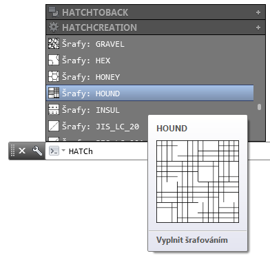 Vyberte název šrafy a kliknutím do uzavřené oblasti nebo objektu ve výkresu šrafu vložte.