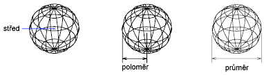 Kouli můžete vytvořit určením středu a bodu na poloměru. Hladkost zakřivených 3D těles, jakým je například koule, ve stínovaném nebo skrytém vizuálním stylu můžete řídit pomocí systémové proměnné FACETRES.