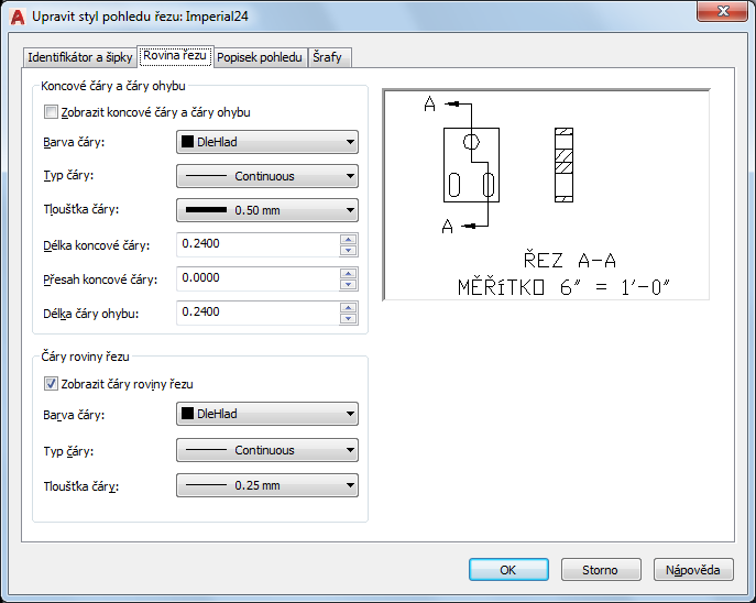 Slouží k nastavení vlastností pro konce, ohyby a segmenty čar rovin, které jsou používány liniemi řezu.