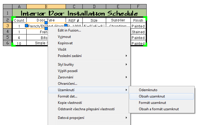 Ve výchozím nastavení jsou všechny buňky v tabulce extrakce dat uzamčeny proti úpravám a odemčeny pro změny formátování. Buňky lze odemknout nebo uzamknout proti úpravám dat a formátování pomocí místní nabídky.