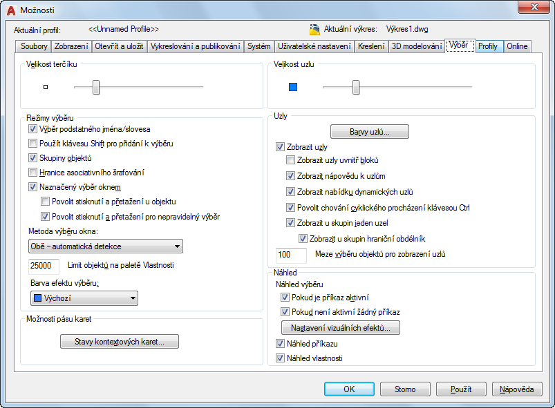 Zobrazí náhled výběru, když nejsou aktivní žádné příkazy. (Systémová proměnná SELECTIONPREVIEW)