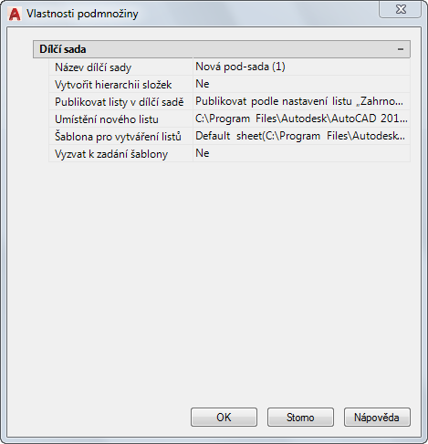 Určuje soubor výkresové šablony (DWT) a název rozvržení, který je použit při tvorbě nových výkresových souborů v této podsadě.