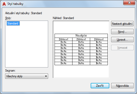 Vymaže styl tabulky vybraný v seznamu Styly. Styl použitý ve výkresu nelze vymazat.