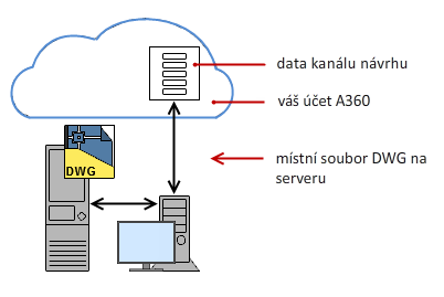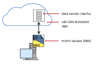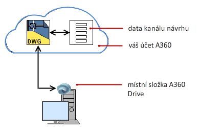 Alternativou k ukládání výkresových souborů do vašeho účtu služby A360 může být jejich místní uložení na pevném disku počítače. V tomto případě jsou data kanálu návrhu pro tyto výkresy stále uložena ve službě A360, ale spojení s daty kanálu návrhu je udržováno pomocí jedinečného ID kanálu návrhu – do výkresu vloženého odkazu na data kanálu návrhu.