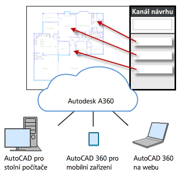 Paleta Kanál návrhu umožňuje přidat do výkresu poznámky a obrázky, které potom lze sdílet s kolegy, klienty a konzultanty online prostřednictvím služby Autodesk A360.