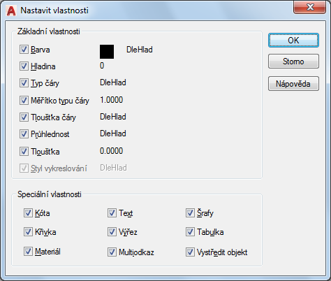 Změní styl vykreslování cílového objektu na styl vykreslování zdrojového objektu. Pokud pracujete ve stylu vykreslování závislém na barvě (proměnná PSTYLEPOLICY je nastavena na hodnotu 1), tato volba není k dispozici. K dispozici pro všechny objekty kromě objektů s použitým modifikátorem roztřesených hran.
