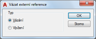 Sváže vybranou referenci DWG s aktuálním výkresem. Syntaxe pojmenovaných objektů závislých na externích referencích se změní z názevbloku|názevdefinice na názevbloku$n$názevdefinice. Tímto způsobem jsou vytvořeny jedinečné pojmenované objekty všech tabulek definic závislých na externích referencích navázaných do aktuálního výkresu.