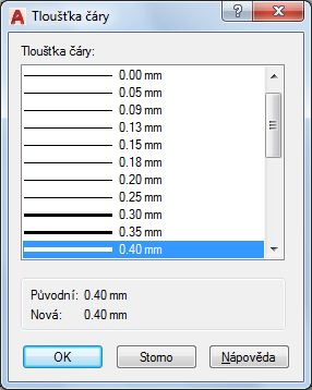 Zobrazuje dostupné tloušťky čar. Dostupné tloušťky čar obsahují pevné tloušťky, které jsou běžně používány ve výkresech. Vybráním tloušťky čáry ji použijete.