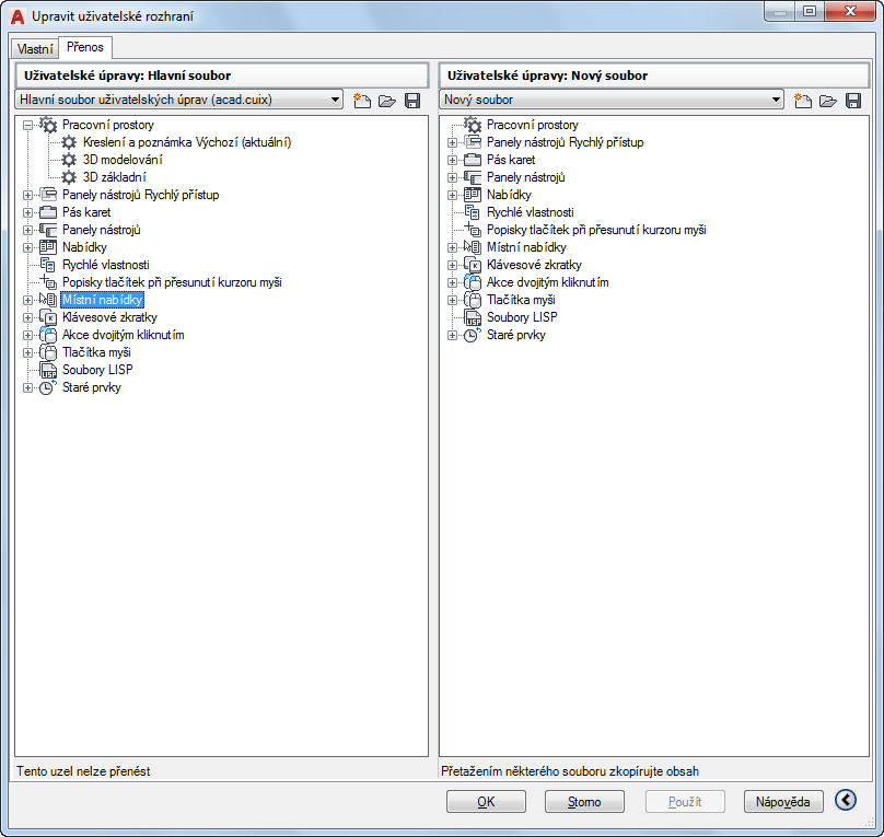 Když na příkazovém řádku zadáte příkaz IMPORTCUI, hlavní soubor CUIx se zobrazí v pravém podokně (ve výchozím nastavení se jedná o acad.cuix pro soubory aplikace AutoCAD a acadlt.cuix pro soubory aplikace AutoCAD LT). Chcete-li data přenést, otevřete soubor CUIx nebo původní soubor uživatelských úprav v levém podokně. Zadáte-li na příkazovém řádku příkaz EXPORTCUI, zobrazí se v levém podokně hlavní soubor CUIx. Chcete-li data přenést, otevřete jiný soubor CUIx nebo původní soubor uživatelských úprav v pravém podokně.