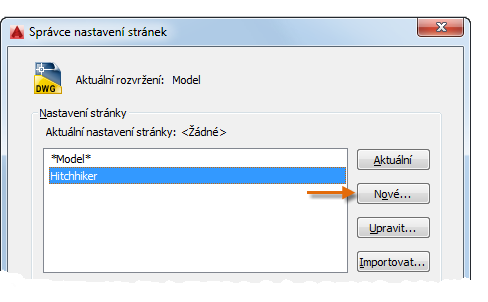 Chcete-li Správce nastavení stránek otevřít, klikněte pravým tlačítkem na kartu Model nebo Rozvržení a vyberte položku Správce nastavení stránek. Příkaz je VZHLEDSTR.