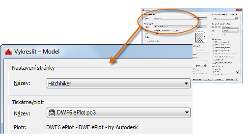 Z praktických důvodů lze uložit a obnovit kolekce těchto nastavení podle názvu. Označují se jako nastavení stránky. Pomocí nastavení stránky můžete uložit nastavení, které potřebujete pro různé tiskárny, tisk ve stupních šedé, vytvoření souboru PDF z výkresu atd.