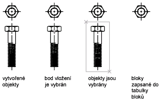 Na následujícím obrázku vidíte typický postup při vytváření definice bloku ve výkresu.