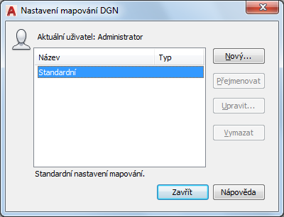 Slouží k vytvoření, přejmenování, úpravě a odstranění nastavení mapování pro import nebo export dat DGN.