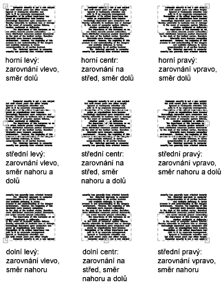 - Určuje zarovnání a tok nového nebo vybraného textu ve vztahu k hranicím textu. Na nový text bude použito aktuální zarovnání. Daný text je zarovnán do specifikovaného obdélníku podle nastavení zarovnání a jednoho z devíti bodů zarovnání na obdélníku. Bod zarovnání vychází z prvního bodu použitého pro určení obdélníku. Text je zarovnáván vlevo, vpravo nebo na střed s ohledem na levou a pravou hranici textu. Mezery vložené na konec řádku jsou zahrnuty jako součást textu a ovlivňují zarovnání řádku. Tok textu řídí, zda je text zarovnán na střed, zdola nebo shora s ohledem na horní a dolní hranici.