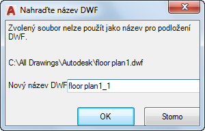 Názvy připojovaných referencí DWF nebo DWFx musí být jedinečné. Při pokusu o připojení dvou referencí DWF nebo DWFx se stejným názvem se zobrazí dialog Nahraďte název DWF.