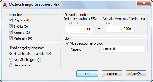 Určuje, co se má importovat, jak mají být přiřazeny hladiny k importovaným objektům, jednotky převodu a zda má být soubor FBX importován jako blok.