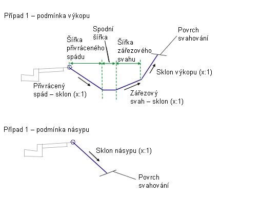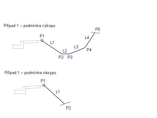 Pouze podmínka výkopu – vnitřní hrana příkopu Pouze podmínka násypu – bod linie paty svahu |