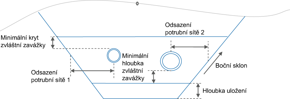 Jsou-li vybrány dvě potrubní sítě, bude za síť, která leží nalevo od základny, považována Potrubní síť 1. Za síť ležící na pravé straně trasy bude považována Potrubní síť 2. Tloušťka materiálu daná hodnotou Minimální tloušťka zvláštní zavážky je určena hodnotou většího ze dvou vnějších průměrů potrubí, k níž je přičtena hodnota Minimální krytí zvláštní zavážkou. Dno a hloubka příkopu jsou určeny hodnotou menšího ze dvou vnějších průměrů potrubí, k niž jsou přičteny hodnoty Minimální tloušťka zvláštní zavážky a Hloubka lože.