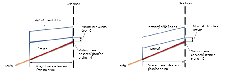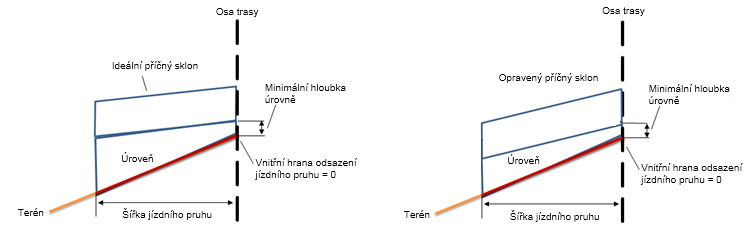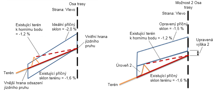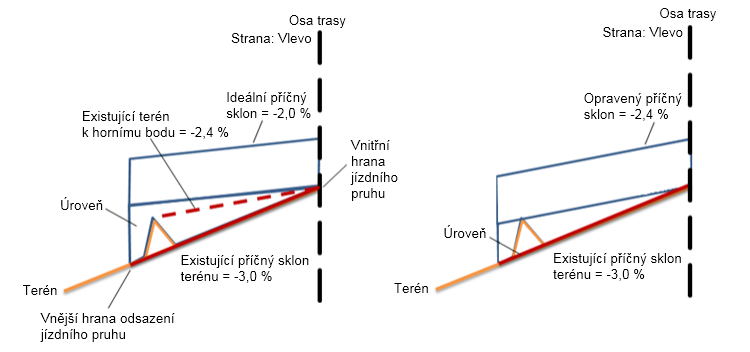 | Tolerance sklonu | Příčný sklon horního bodu mínus ideální příčný sklon se rovná -1,2 %, což je hodnota větší než tolerance sklonu (0,5 %). Příčný sklon existujícího terénu mínus ideální příčný sklon se rovná 1,0 %, což je hodnota větší než tolerance sklonu (0,5 %). |