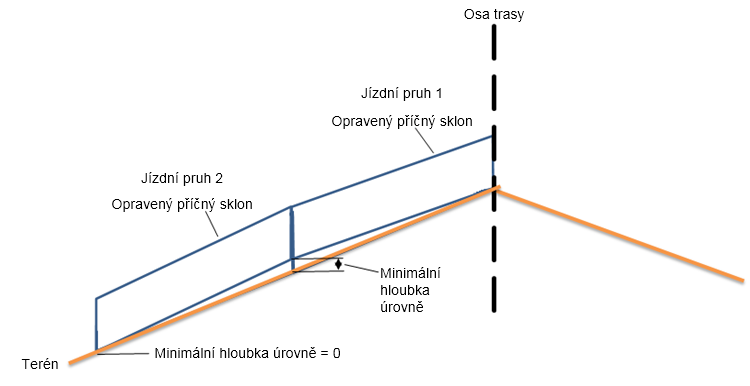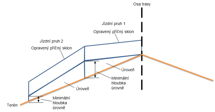 | Opravený příčný sklon | Opravený příčný sklon se nastaví mezi hodnoty -1,5 % a -2,5 %. |