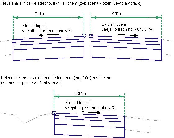 Sklon klopení jízdního pruhu se získá ze specifikací klopení pro trasu základní linie. Můžete určit který sklon klopení se pro jízdní pruh použije.