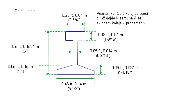 Poznámka: všechny rozměry jsou v metrech nebo stopách, pokud není uvedeno jinak. Všechny sklony jsou uvedeny v podobě poměru (například 4 : 1), pokud nejsou označeny jako procentní sklony se značkou „%“.