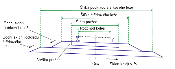 Spojnice pro koleje, pražce, štěrkové lože a podklad štěrkového lože se vypočtou a umístí na základě zadaných hodnot vstupních parametrů. Jestliže je hodnota Sklon kolejí v % nenulová, výška profilu koridoru se zachová ve středu kolejí na nízké straně. Upravený terén, pražce, štěrkové lože a podklad štěrkového lože se zachovají s hodnotou položky Sklon kolejí v %.