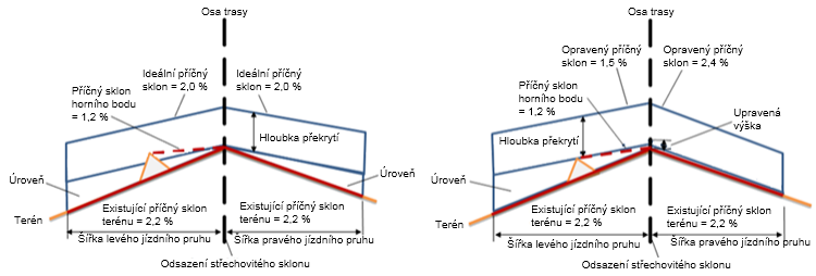 | Opravený příčný sklon | Opravený příčný sklon se upraví na hodnotu mezi -1,5 % a -2,5 % příčného sklonu. |