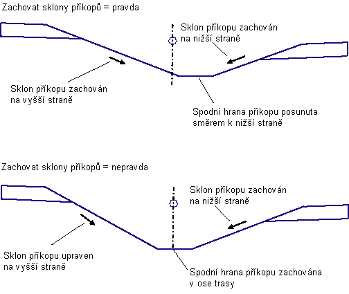 Klopení nebo odbočovací pruhy mohou být příčinou, že horní části sklonů příkopu budou na levé a pravé straně v různých výškách, což vede ke vzniku asymetrického příkopu. Jsou dvě možnosti, jak řešit tuto situaci. Jestliže pole Zachovat sklony příkopu má hodnotu Ano, pak dané sklony příkopu se zachovají na obou stranách, čímž se posune příkop od středové osy k nižší straně. Jestliže má hodnotu Ne, spodní část příkopu se vycentruje kolem středové osy středního dělicího pásu, daný sklon se zachová na nižší straně a sklon se upraví tak, aby odpovídal vyšší straně.
