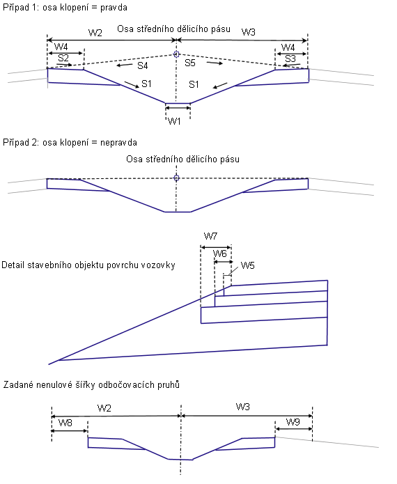 V režimu návrhu tato podsestava vypočte a zobrazí střední dělicí pás a krajnici na základě zadaných vstupních parametrů se sklony jízdního pruhu -2 %, sklony zpevněné krajnice -5 % a s šířkami odbočovacího pruhu rovnými nule.