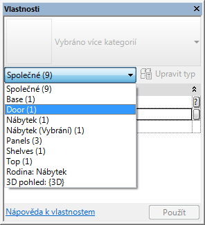 Bezprostředně pod seznamem Výběr typu se nachází filtr určující kategorii prvků, které budou pomocí nástroje umístěny, nebo kategorii a počet prvků vybraných na kreslicí ploše. Při výběru více kategorií nebo typů se na paletě zobrazí jen ty vlastnosti instancí, které jsou pro všechny společné. Když je vybráno více kategorií, můžete pomocí rozevíracího seznamu filtru zobrazit pouze vlastnosti určité kategorie nebo samotného pohledu. Volba specifické kategorie neovlivní celkovou sadu výběru.