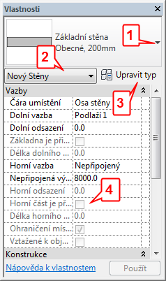 Ve většině případů (výjimky jsou uvedeny níže) se na paletě Vlastnosti zobrazují jak vlastnosti instance, které může uživatel upravovat, tak i vlastnosti instance, které jsou určeny pouze ke čtení (vystínované). Vlastnost může být určena pouze ke čtení proto, že její hodnotu vypočítává nebo automaticky přiřazuje software, případně z toho důvodu, že závisí na nastavení jiné vlastnosti. Například vlastnost stěny Nepřipojená výška lze upravovat jen v případě, že je u její vlastnosti Horní vazba nastavena hodnota Nepřipojená. Specifické závislosti jsou uvedeny v popisech vlastností instancí jednotlivých typů prvků.