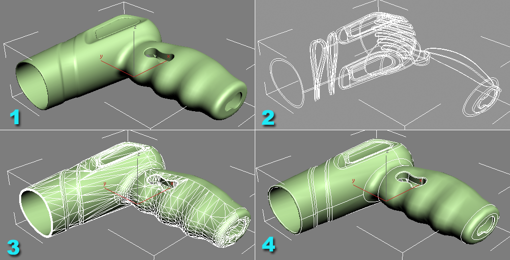 Mit dieser Option werden Scheitelpunkte verschweißt und Glättungsgruppen anstelle der natürlichen Oberflächennormalen verwendet. Dies ist vor allem nützlich, wenn das Netz des Ansichtsfensters zur Umwandlung in ein bearbeitbares Netz vorbereitet wird. Dabei sind Schweißvorgänge erforderlich. Wenn Sie diese Option nicht verwenden, entstehen zwischen einigen Flächen des Ausgabenetzes doppelte Scheitelpunkte an den Kantengrenzen zwischen den Flächen der Körperobjekte.