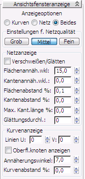 Mit den Einstellungen im Bereich "Netzanzeige" steuern Sie die Anzeige von Körperobjekten im Ansichtsfenster. Diese Einstellungen werden auch bei der Umwandlung in das Format für bearbeitbare Netze/Polys verwendet, um die Erstellung der Polygone zu steuern.