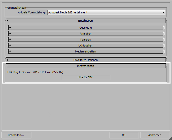 Das Rollout Informationen enthält Daten zum 3ds Max FBX plug-in sowie eine Schaltfläche, die Sie zum Zugriff auf die Hilfe zum 3ds Max FBX plug-in nutzen können.