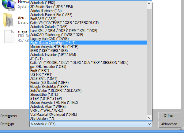 - Verwenden Sie im Dialogfeld "Importieren" das Dropdown-Menü "Dateityp", um den Dateityp in OpenFlight (*.FLT) zu ändern.