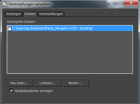 Die Schaltflächen "Neu laden", "Loslösen" und "Binden" sind nur verfügbar, wenn Sie in der Liste "Verknüpfte Dateien" eine Datei markiert haben.