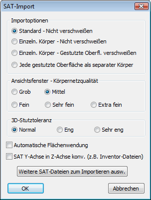 - Standard - Nicht verschweißen Dies ist die Vorgabeoption. Objekte werden separat importiert und nicht miteinander verschweißt. Diese Option ist in der Regel am besten geeignet für SAT-Dateien mit Festkörpern.