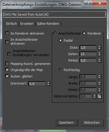 Die Steuerelemente auf dieser Registerkarte sind hinsichtlich Bezeichnung und Aktion mit denen im Rollout Rendern für Splines identisch. Die Werte dieser Einstellungen sind für alle importierten Konturen fest. Sobald der Importvorgang abgeschlossen ist, können Sie die Einstellungen für jedes Objekt wie gewünscht ändern.