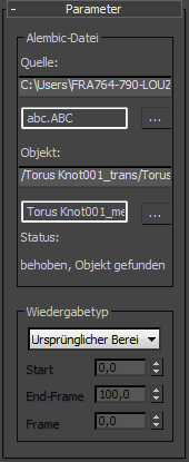 In 3ds Max wird jedes aus einer Alembic-Datei (.abc) importierte Objekt als Alembic-Objekt angezeigt. Animierte Alembic-Objekte verfügen über AlembicXform-Controller.