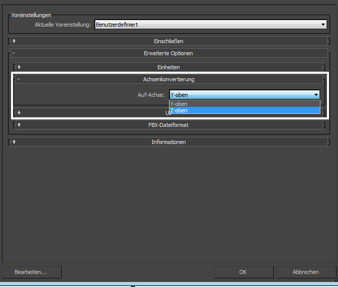 Die FBX-Export-Plug-Ins bieten zwei Optionen für die Achsenkonvertierung an, "Y-oben" oder "Z-oben".