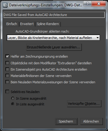 Tipp: Beim Neuladen einer Datei wurden die meisten Materialien aus der DWG-Datei bereits von 3ds Max in der Szene erstellt. Sie werden nicht neu übertragen. Wenn Sie ein Szenenmaterial mit den Definitionen aus der Zeichnung aktualisieren möchten, deaktivieren Sie diese Option.