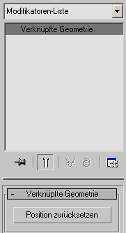 Verknüpfte Objekte werden in der Modifikatorgruppe als verknüpfte Geometrieobjekte angezeigt. Diese Objekte erlauben keinen Zugriff auf Unterobjektebenen, wo weniger schwerwiegende Bearbeitungen erfolgen können. Wenn ein verknüpftes Geometrieobjekt verschoben, gedreht oder skaliert wird, können Sie die Option "Position zurücksetzen" verwenden.