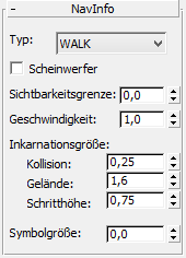 Mit dem Helfer "NavInfo" können Sie einen VRML97-Orientierungsinfo-Knoten erstellen. Dadurch wird dem Browser mitgeteilt, wie er sich in der VRML97-Welt zurechtfinden kann.