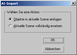 Wenn Sie den Befehl "Importieren" verwenden, um Geometrie in eine Szene zu importieren, die bereits Geometrie enthält, werden Sie in den meisten Fälle in einem Dialogfeld von 3ds Max gefragt, ob Sie die importierte Geometrie zu der Szene hinzufügen oder die Szene ganz ersetzen möchten.