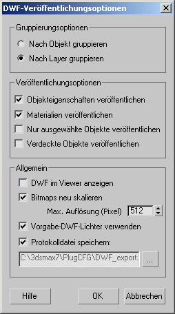 - Wenn diese Funktion aktiviert ist, erstellt 3ds Max eine Textdatei mit der Erweiterung .log, in der Objekte und die zugehörigen Layer, die Anzahl der Flächen und Scheitelpunkte sowie Uhrzeit und Datum des Exports aufgelistet werden. Nicht ausgewählte oder ausgeblendete Objekte werden als nicht exportiert vermerkt. Die Protokolldatei wird bei jeder neuen Erstellung einer DWF-Datei überschrieben, es sei denn, Sie ändern den Namen oder den Speicherort der Protokolldatei. Vorgabe = Aktiviert.