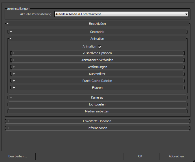 Dieses Kapitel enthält Informationen zu den Optionen, die Ihnen im Fenster des Exportprogramms für das 3ds Max FBX plug-in zur Verfügung stehen.