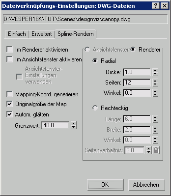 Auf der Registerkarte "Spline-Rendern" im Dialogfeld "Importoptionen" können Sie festlegen, wie Spline-Objekte aus DWG- und DXF-Dateien in den Ansichtsfenstern angezeigt werden und wie sie vom 3ds Max-Renderer verarbeitet werden.