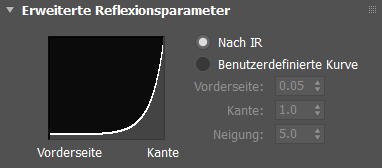 Im Rollout Erweiterte Reflexionsparameter für physikalisches Material können Sie auswählen, ob die winkelabhängige Reflektivität auf dem Refraktionsindex des Materials oder auf einer benutzerdefinierten Kurve basieren soll.