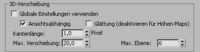 - Wählen Sie das Zielobjekt, klicken Sie anschließend mit der rechten Maustaste, und wählen Sie "Eigenschaften" aus. Klicken Sie im Dialogfeld "Objekteigenschaften" auf die Registerkarte "Mental Ray", und nehmen Sie im Bereich "3D-Verschiebung" folgende Einstellungen vor: